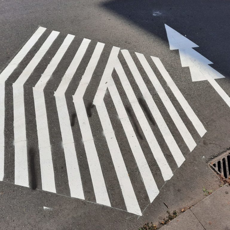 Un message caché sur la rue. Projet " Marquage Place Système ", Commune d'Anderlecht : Rue Brogniez, Sq. R. Pequeur, Rue Lambert Crickx. Bruxelles, Belgique. Août 2020.